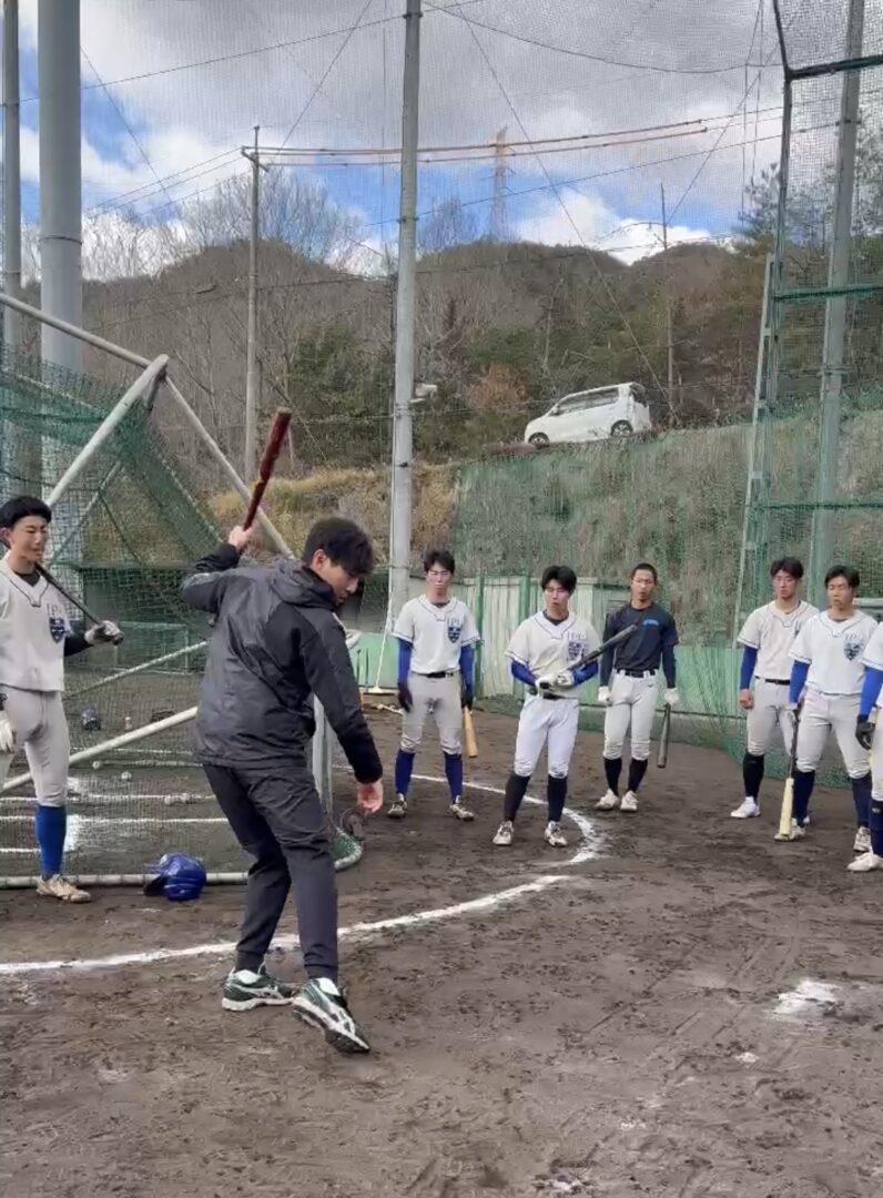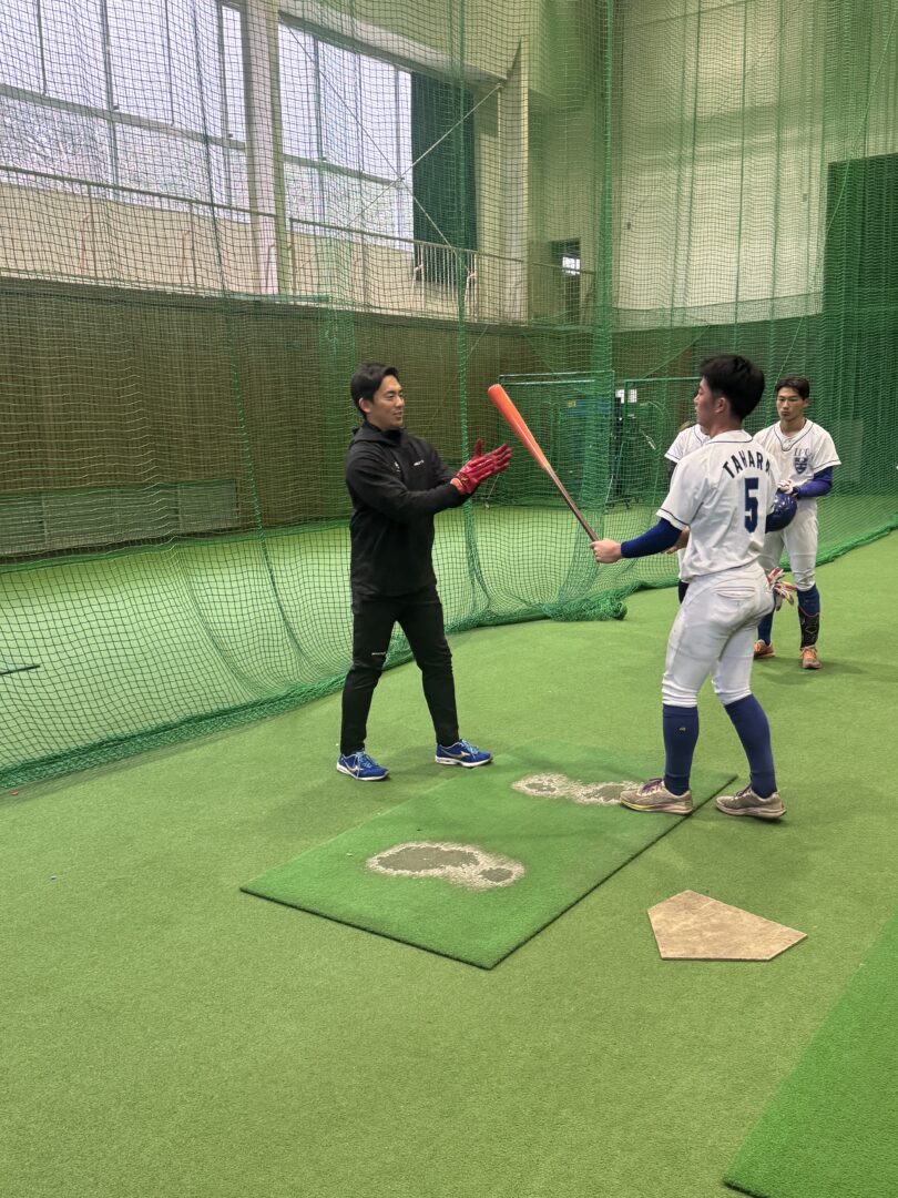 野手を中心にバッティング指導をしていただきました。室内では実践的なドリルや効果的な練習方法を学び、メイングラウンドでは実際の打撃練習を通してフォームや体の使い方について具体的なアドバイスをいただきました。一つ一つの動きの意味や考え方まで丁寧に教えていただき、多角的な視点からバッティングを見つめ直すことができました。