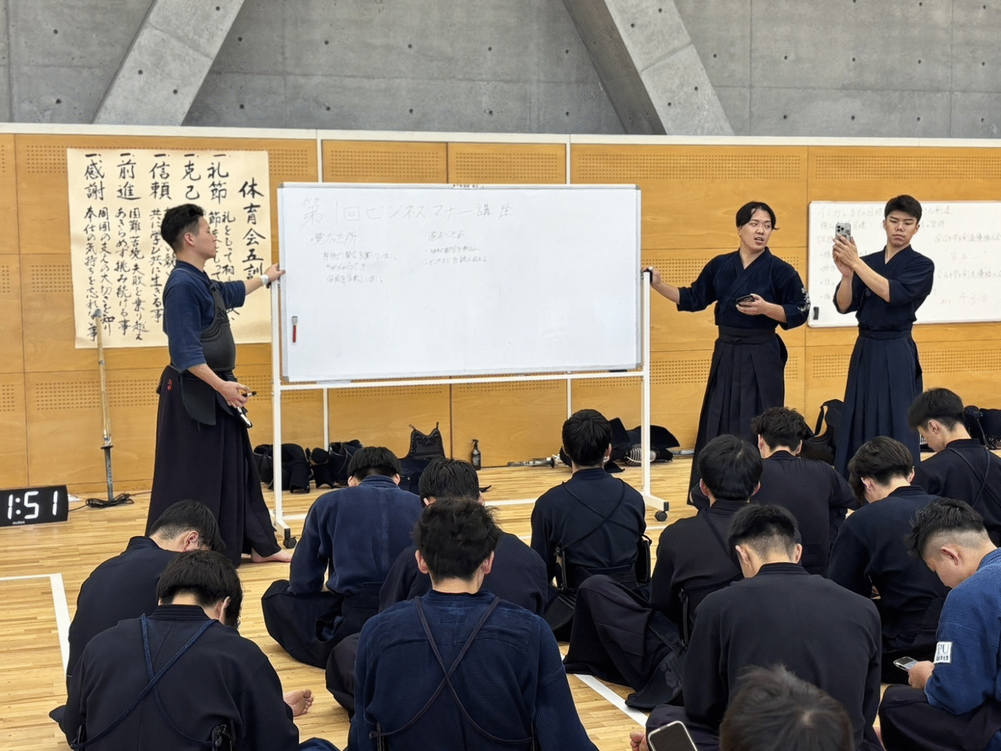 本日の稽古後に企画部3年の前田・納冨を中心に、ビジネスマナー講義を行いました。