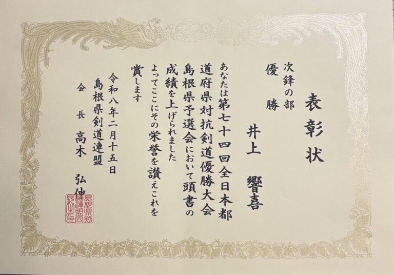 これにより、井上は和歌山ビックホエールにて行われる第74回全日本都道府県対抗剣道優勝大会への出場権を賜りましたことをご報告申し上げます。