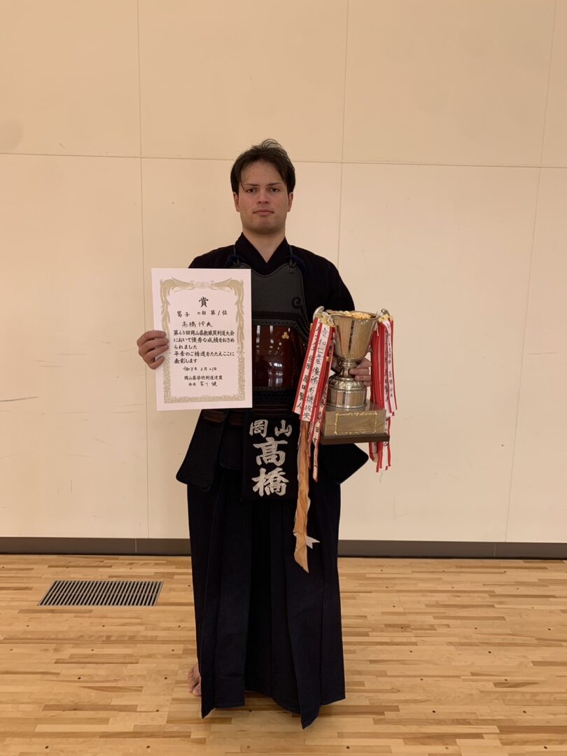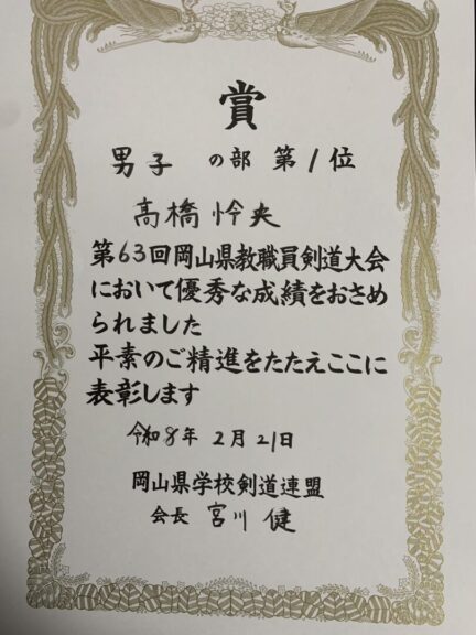 先日、岡山武道館にて開催されました「第63回全国教職員剣道大会岡山県予選男子の部」におきまして、髙橋怜央先生が優勝し、見事二連覇を達成いたしましたことをご報告申し上げます。
