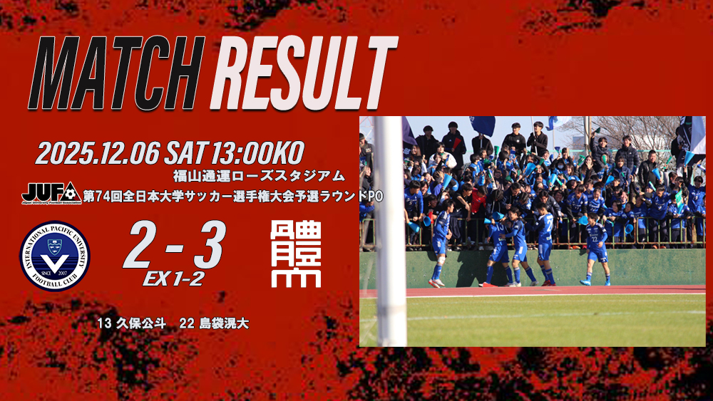 【試合結果】岡山大学サッカー2部リーグ第6節 岡山大学B 戦 2025 10/16 2025年10月16日 2025年10月13日(月・祝)に行われた、岡山大学サッカー2部リーグ第6節 の結果をお知らせいたします。 令和7年10月13日(日)【試合結果】 #岡山県学生サッカーリーグ2部第6節 #岡山大学B vs #環太平洋大学 . 前半0-5 後半1-5 合計1-10 . 【得点者】 10 #石川悠生 (#奈良南)④ 14 #小林宗吾 (#神村学園)② 33 #田邊健朗 (#広島観音) 4 #西田亮大 (#柏原)③ 資料請求 よかったらシェアしてね! URLをコピーしました! URLをコピーしました! 【試合結果】インディペンデンスリーグ中国2025プレーオフ3試合結果 2025年度中国大学サッカーリーグ第16節 vs 福山大学に勝利!16戦16勝! 関連記事 【試合結果】第9回中国大学サッカー新人戦 決勝 2025年11月10日 4年 羽山温音 氏「U-22日本代表 国際親善試合 イングランド遠征」帯同のお知らせ 2025年11月7日 【アットホームカップ2025 第23回インディペンデンスリーグ全日本大学サッカーフェスティバル】 2025年11月6日 第53回中国サッカーリーグ閉幕 環太平洋大FCが4年ぶり表彰台に 2025年11月1日 2025年度 中国大学サッカーリーグ 18戦17勝1分けで無敗優勝! 2025年10月27日 環太平洋大クラブ 岡山社会人サッカーリーグで創部初優勝! 2025年10月27日 【インディペンデンスリーグ中国2025】環太平洋大学A 6年ぶり10度目の優勝! 2025年10月27日 松岡響祈(3年/サガン鳥栖U-18出身)J2サガン鳥栖 2027シーズン入団内定のお知らせ 2025年10月24日