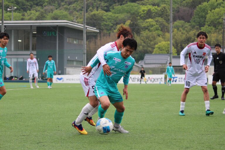 ホーム瀬戸グラウンドにENEOS水島を迎えての一戦。 前半6分、セットプレーから相手にヘディングシュートを叩き込まれ、先制を許す苦しい立ち上がりとなります。反撃に出たいIPU FCは、前線の高橋(尚)や中野を中心に相手ゴールへ迫りますが、得点を奪えず0-1で前半を折り返します。
