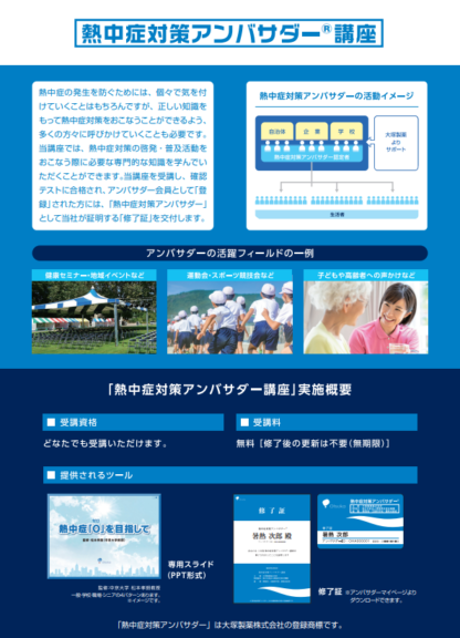 特筆すべきは、大塚製薬株式会社と連携した「熱中症対策アンバサダー」資格の導入です。