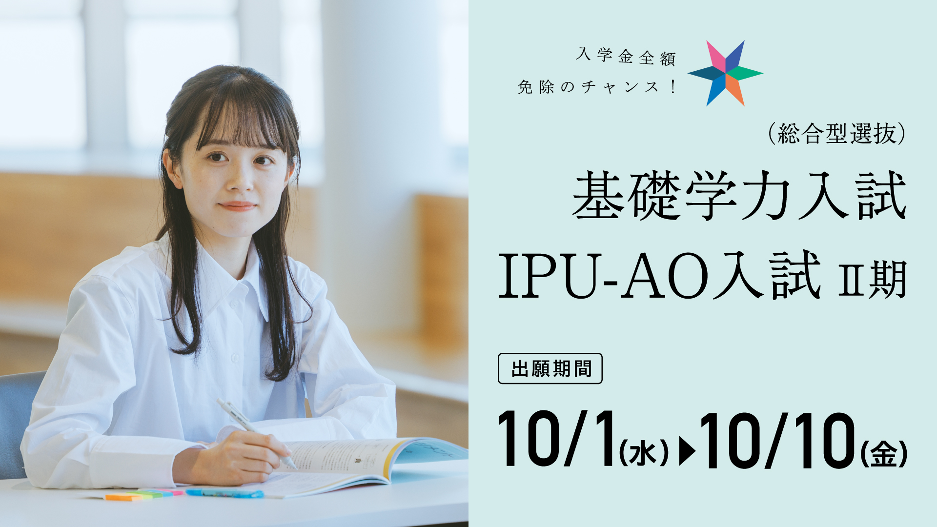 今年度2回目となる入試「基礎学力入試」「IPU-AO入試Ⅱ期」の出願受付は10/1(水)から開始です。