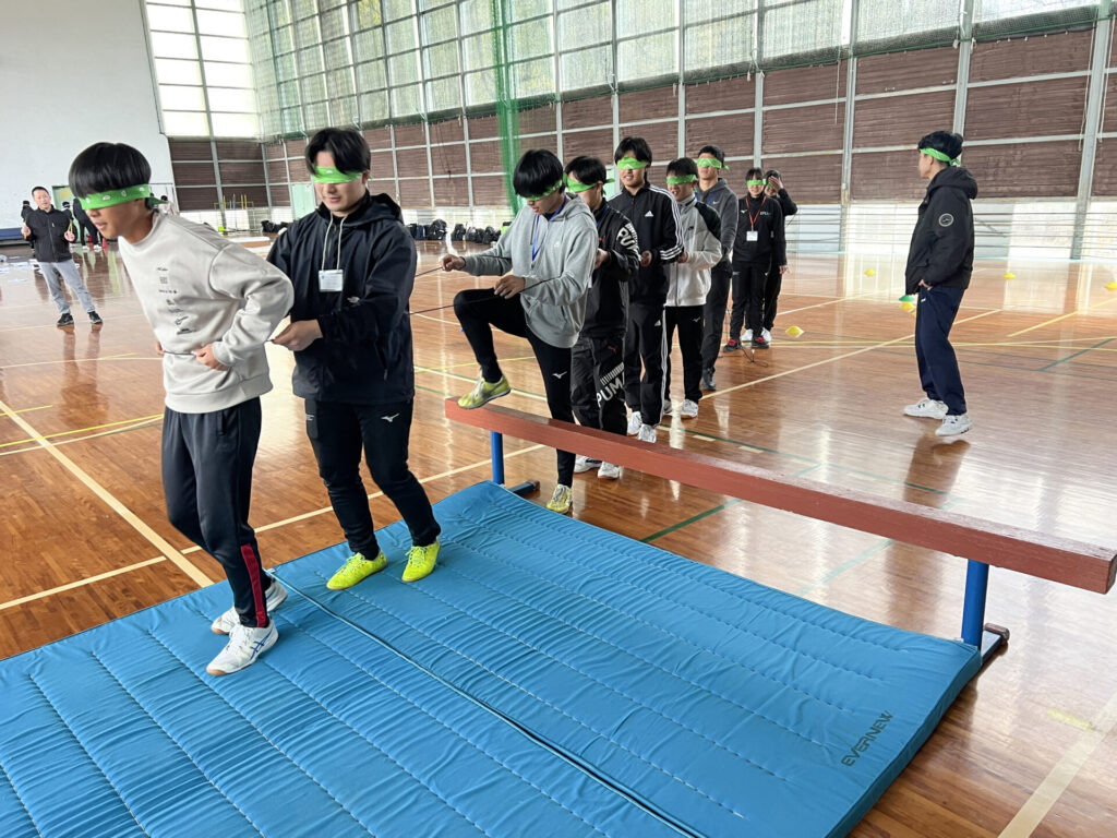 そして、チームビルディングとして、配ったバンダナの色で分かれてチームとなり、目隠し障害物競争を実施しました。リーダーはメンバーを安全に前に進められるように声をかけ、誘導してチームを引っ張りました。メンバー同士が相手を思いやり、協力してゴールを目指しました。最後は、全員で五訓唱和をしっかりと行ない、キャンプを終えました。
