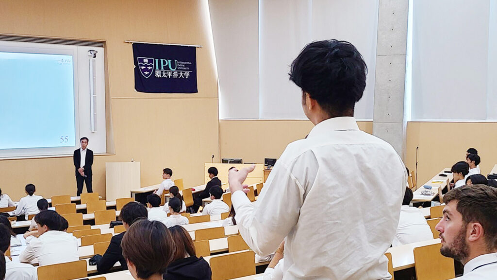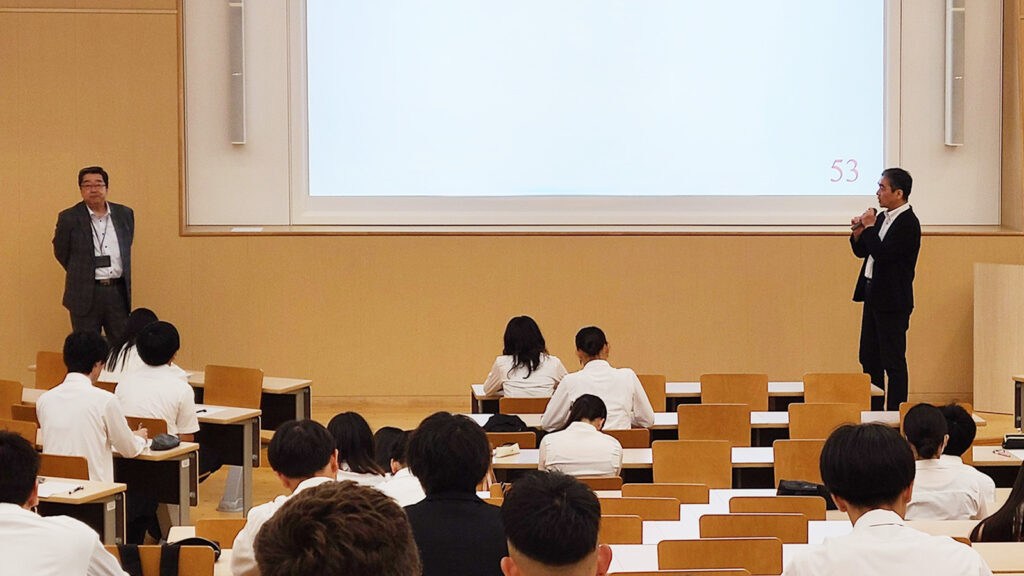 また、2025年前期にはキャリアデザインの授業にゲストスピーカーとして登壇。進路が決まっていない2年生約150名を対象に、幼少期からの歩みや浪人生活、大学時代の経験、そして現在のホテル経営における実践事例について講演されました。