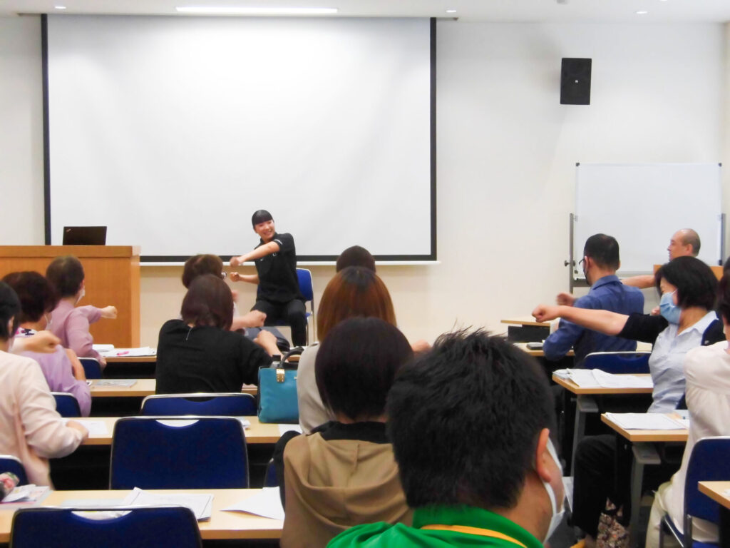 また、実技指導には体育学科伊藤ゼミの3年生・杉田さんも参加し、脳トレを取り入れた楽しい運動プログラムを実施。参加者と一緒に体を動かしながら、笑顔あふれる時間となりました。