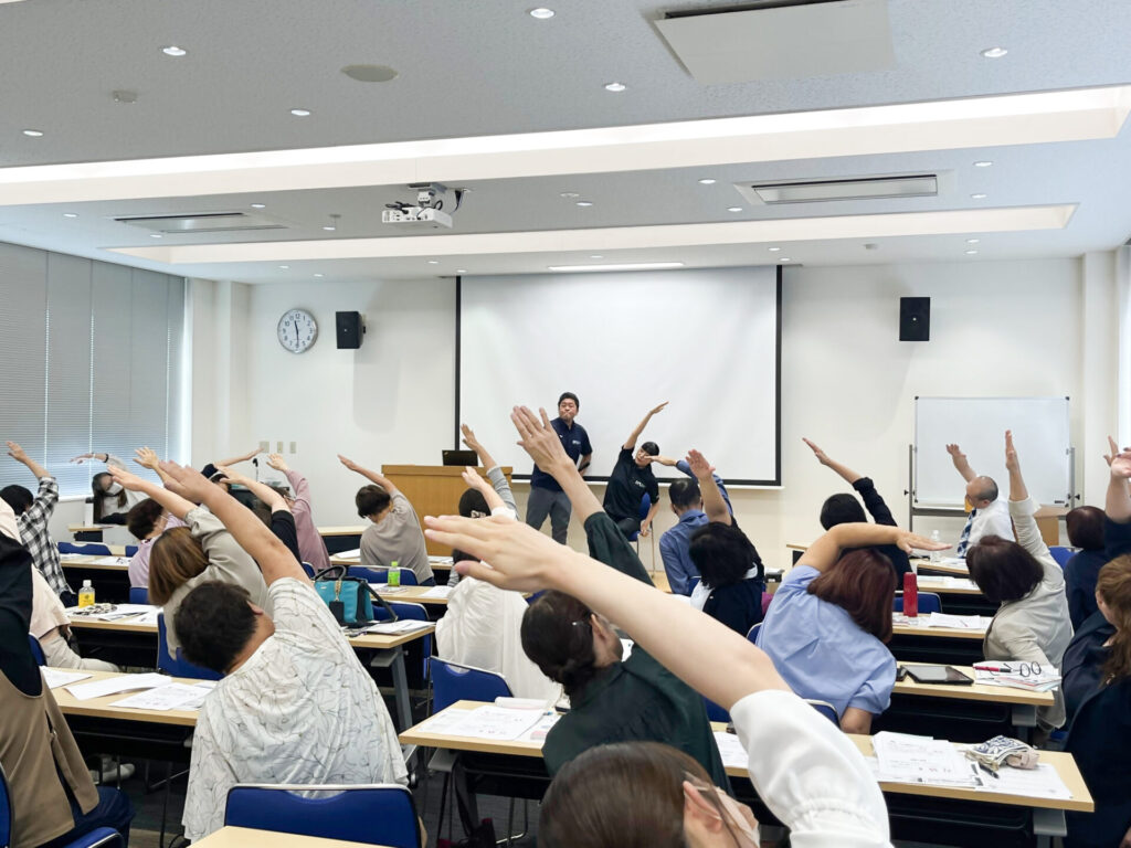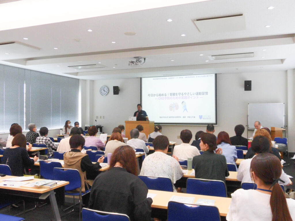 本学体育学部体育学科の伊藤三千雄講師は、運動担当として「今日から始める!腎臓を守るやさしい運動習慣~CKD予防のための実践ポイント~」と題し、講話と実技を行いました。講話では、腎臓を守るための運動療法のポイントとして、