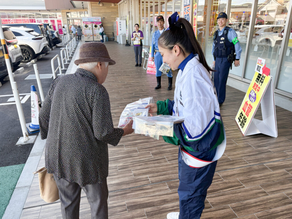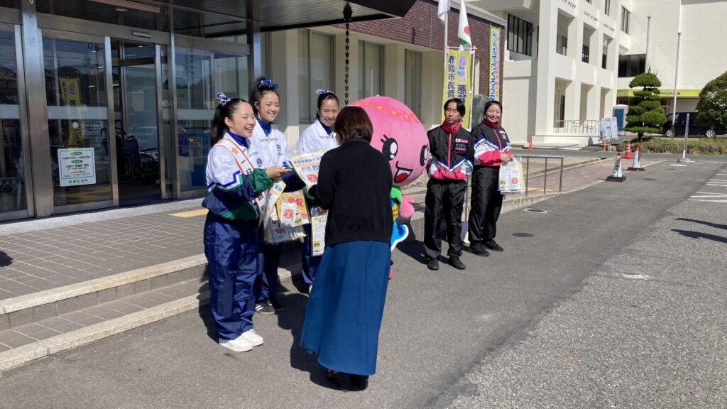 当日は、赤磐警察署にて出発式に参加したのち、ダンス部とチアリーディング部によるパフォーマンス演出で会場は盛り上がりをみせました。両部の学生が一日警察隊長に選出され、挨拶と委嘱式が執り行われた後、地域の商業施設へ移動し、警察官や地域のボランティアの方々と一緒に啓発チラシの配布を行いました。