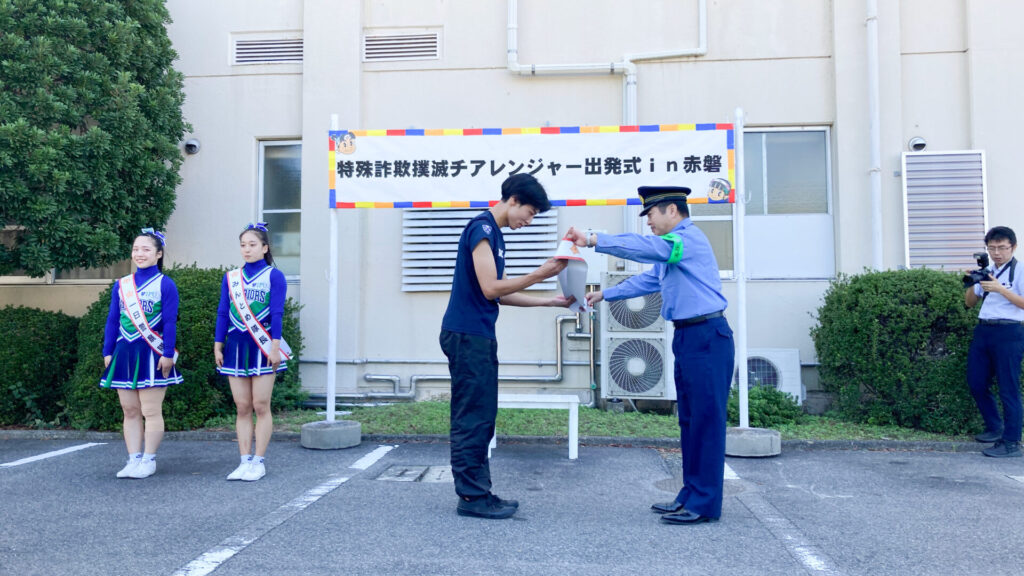 当日は、赤磐警察署にて出発式に参加したのち、ダンス部とチアリーディング部によるパフォーマンス演出で会場は盛り上がりをみせました。両部の学生が一日警察隊長に選出され、挨拶と委嘱式が執り行われた後、地域の商業施設へ移動し、警察官や地域のボランティアの方々と一緒に啓発チラシの配布を行いました。