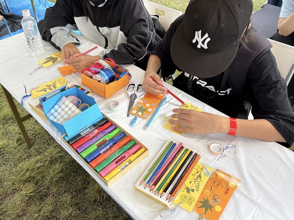 「しおりづくり」では、秋の自然素材を使って子どもたちが自由な発想で作品を仕上げ、完成した作品を手に持って笑顔でブースを後にする姿が印象的でした。