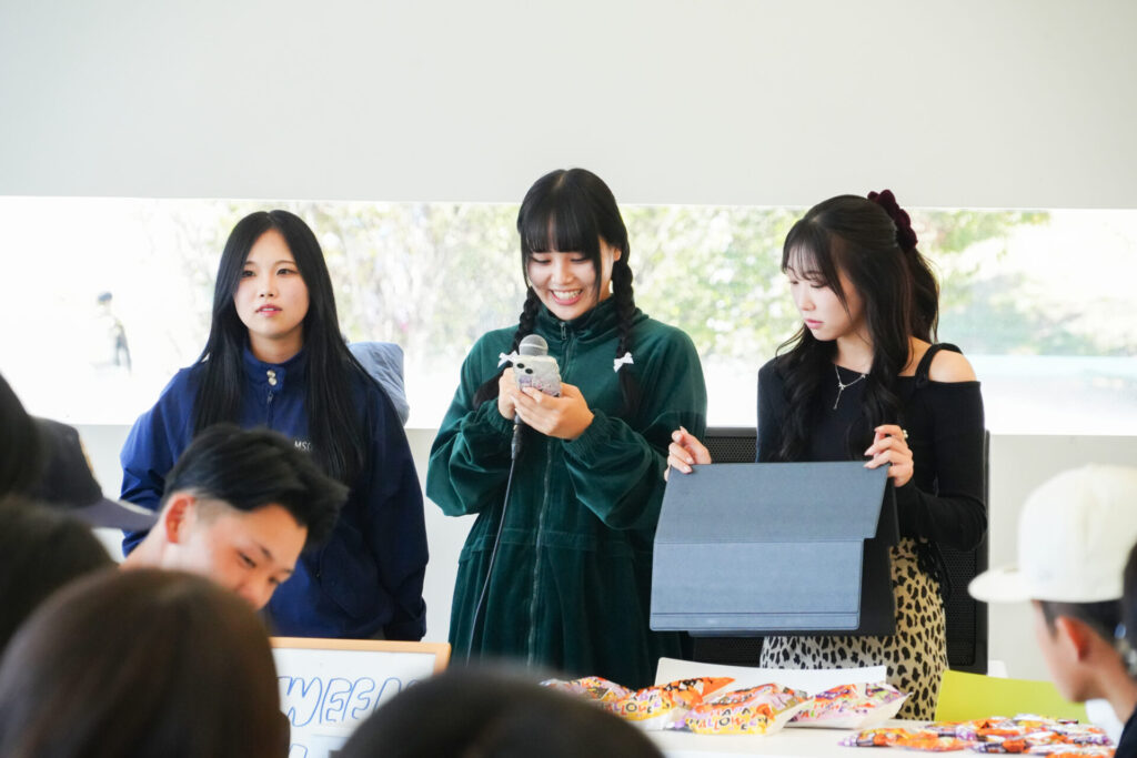 続いて、日本人学生と留学生が混合チームを組み、楽しい交流ゲームを実施。進行を担当したのは、野崎咲月さん、榑林さやさん、大倉愛未さん、そして留学生のオウ・カジョウさん。日本語だけでなく、多言語でコミュニケーションをとり、笑い声と拍手が絶えない国際色豊かな時間となりました。