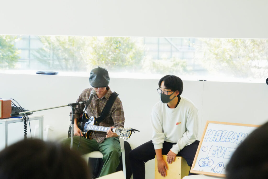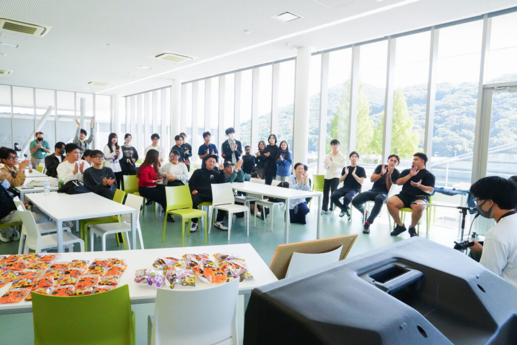 イベントのホストを務めたのは現代経営学科3年生6名(三垣ゼミ&鈴木ゼミ)。オープニングでは、銘苅樹輝さんと上平隼人さんによる即興音楽パフォーマンスが披露され、リズムに合わせて自然と手拍子が広がりました。飛び入りで参加した留学生たちも楽しそうで、会場全体が明るい “Welcome” ムードに包まれました。