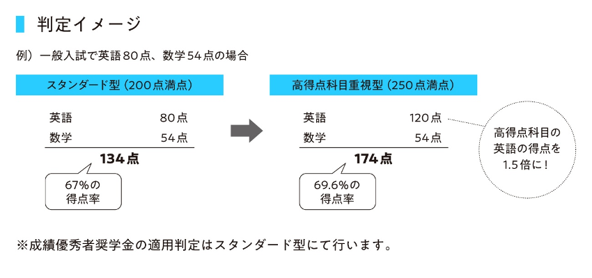 学校推薦入試は、自動W判定方式を導入しています。「スタンダード型判定」では、100点満点×2科目の合計200点満点で判定。さらに「高得点科目重視型判定」では、高得点の科目を1.5倍に傾斜配点し250点満点で判定するため、得意な科目をより活かすことができます。W判定の追加料金はかからず、合格のチャンスがより広がります。