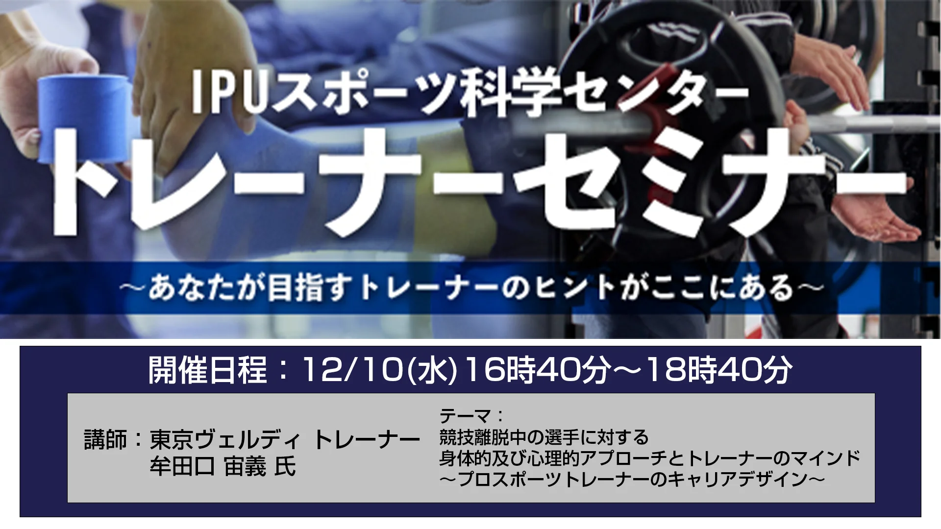 IPU・環太平洋大学のスポーツ科学センターは、アスレティックトレーナー・S&Cコーチ・スポーツ指導者を目指す若手の育成を目的としたトレーナーセミナーを開催いたします。スポーツの競技力向上・普及促進を図るために、スポーツを安全・安心に、そして競技力を向上させるために必要とされるスキルの指導を行います。