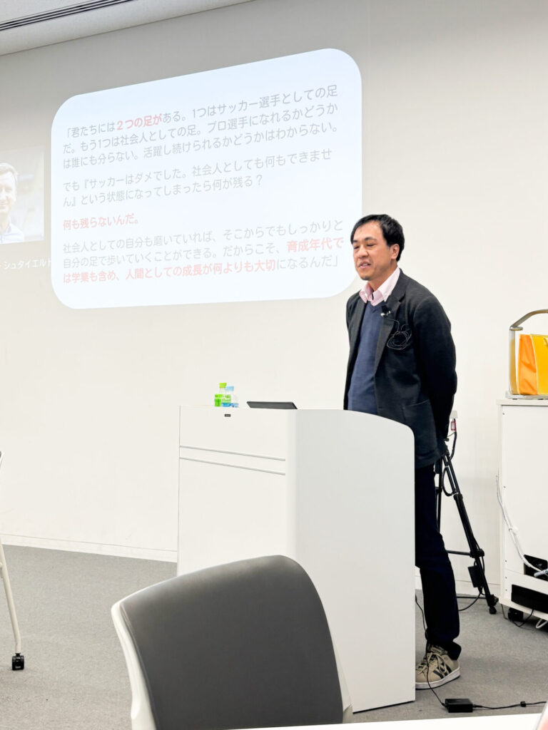 日本とヨーロッパのコミュニケーションの違いとして、ヨーロッパではより良いものを作るための「建設的な議論(ディスカッション)」が重視されるが、日本では対立を避け、現状維持を望む傾向がある点を指摘しました。また、ヨーロッパでは、クラブハウスでの飲食やボランティア活動を通じて、選手が地域やクラブへの貢献意識を高く持っている文化があることを紹介しました。