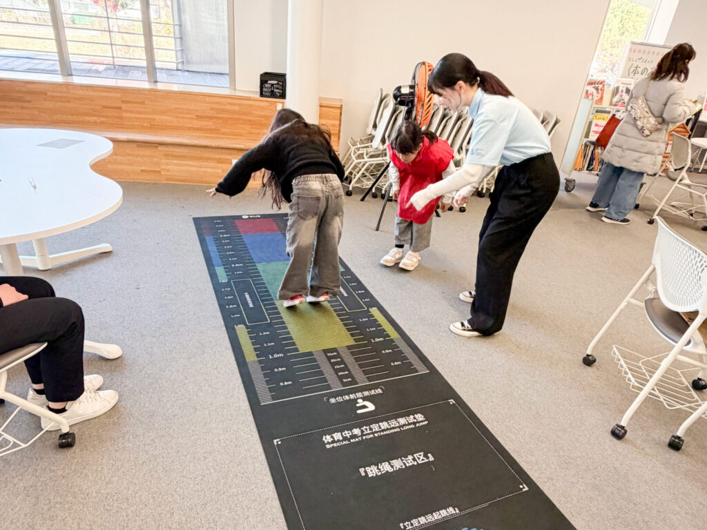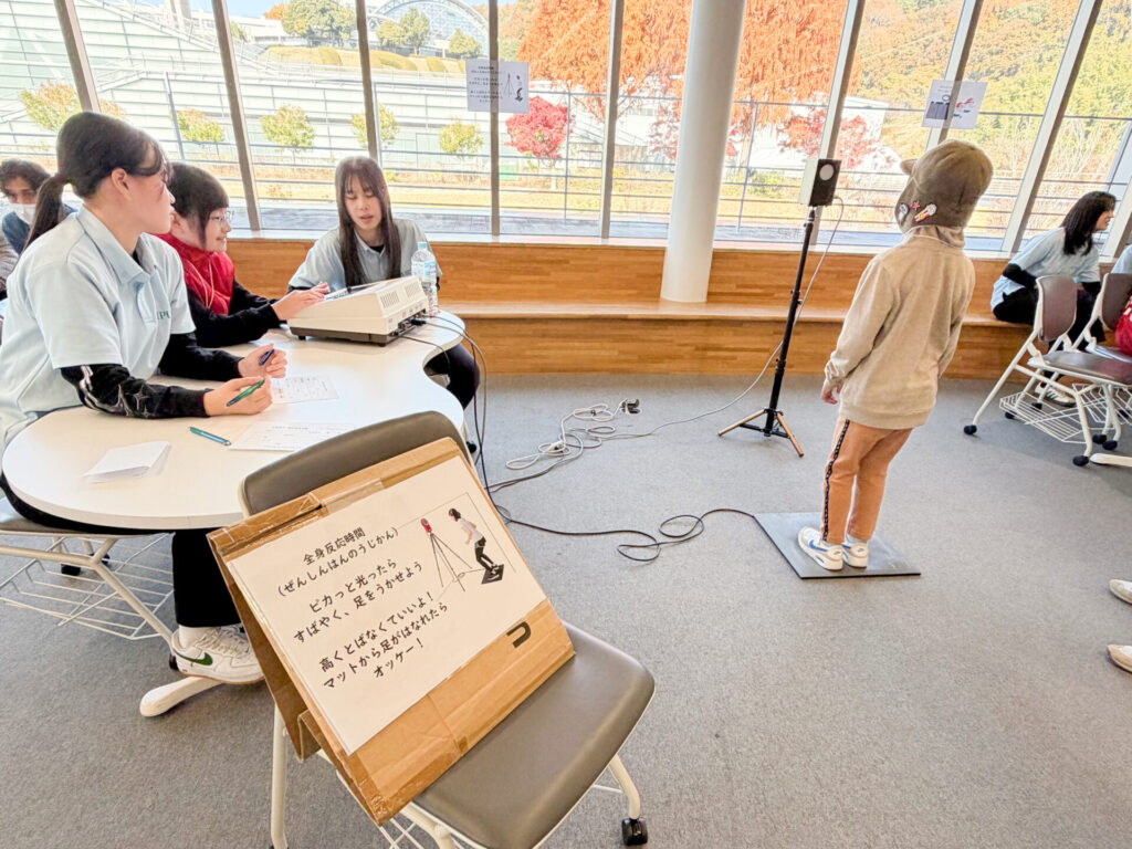 全身反応時間、立ち幅跳び、ステッピングの3種類を体験でき、体の使い方や運動の楽しさを感じてもらう内容となりました。 このブースでは特別企画として、小学生が「職業体験スタッフ」として参加。来場者へ測定方法を説明したり、制作のサポートをしたりと、実際に「教える側」の立場を体験し、貴重な学びの機会となりました。