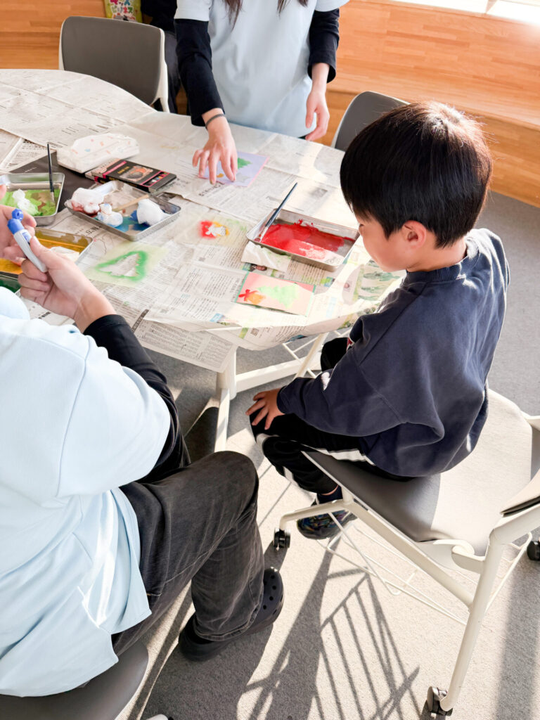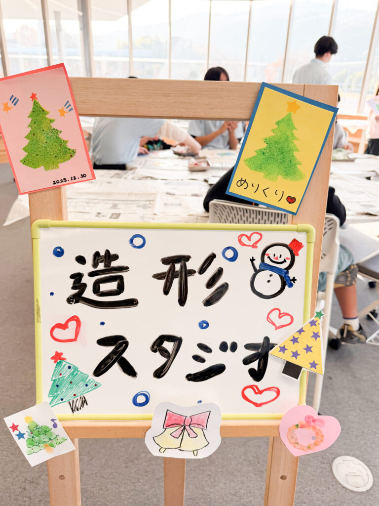 スタンプを使ったクリスマスツリー制作を実施。子どもたちは思い思いの色や形を組み合わせ、オリジナルの作品づくりを楽しみました。