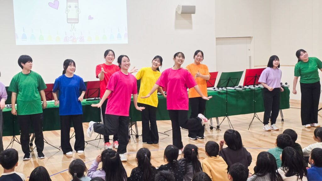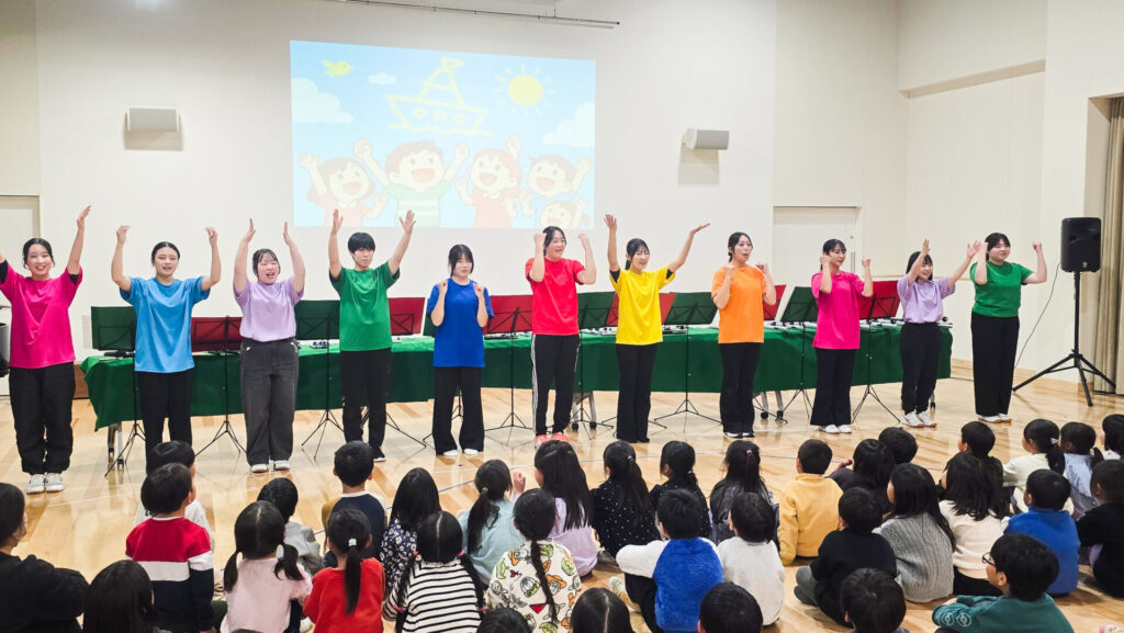 コンサートでは、手遊びや身体表現を取り入れたプログラムをはじめ、トーンチャイム演奏、スライドシアター、参加型アクティビティ、ダンスなど、多彩な内容を展開しました。トーンチャイムによる「おどるポンポコリン」では、子どもたちの元気な歌声と歓声が会場いっぱいに響き渡り、音楽を通した一体感が生まれました。