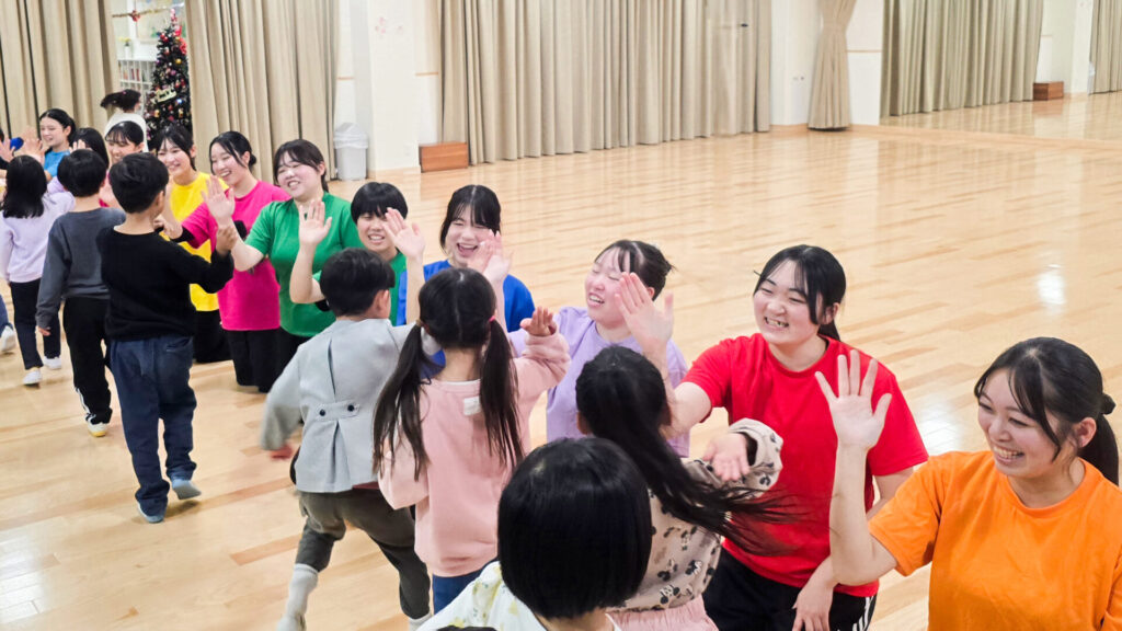 アクティビティ「じゃんけん列車」では、じゃんけんを重ねるごとに列車がどんどん長くなり、最後には長い列車が完成。子どもたちは大興奮の様子で、笑顔あふれる時間となりました。フィナーレのダンス「ハッピージャムジャム」では、お姉さんたちの動きをよく見ながら、子どもたち一人ひとりが全身を使って元気いっぱいに踊る姿が印象的でした。