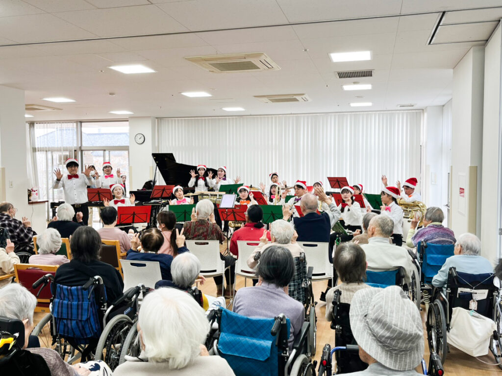 プログラムの冒頭では、ピアノ伴奏に合わせて歌いながら行う手遊び「グーチョキパーでクリスマス」を披露。入居者の皆さまや職員の方々も学生と一緒に歌いながら手を動かし、会場全体が自然と笑顔に包まれ、あたたかな雰囲気の中でコンサートがスタートしました。