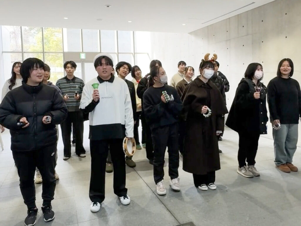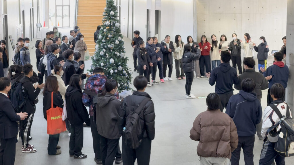 また、グループの入れ替わり時間は、音楽を専門とする教員3名の演奏によって、たすきをつなぎました。お昼休みの50分間、フィロソフィアの建物はきらびやかなクリスマスの音楽と笑顔で満たされ、学生・教職員が集い心温まるひとときとなりました。
