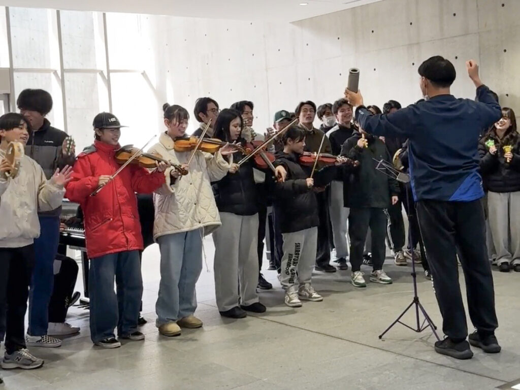 お昼休みになると、本学フィロソフィアのエントランスに設置されたクリスマスツリーの前で演奏が始まり、まるでストリートパフォーマンスのような音楽の場が創出されました。