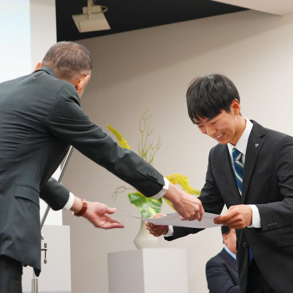 2025年12月11日16時からおかやま信用金庫 本店営業部で行われた表彰式では、現代経営学科2年の赤崎凛さんが登壇。