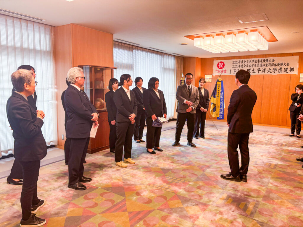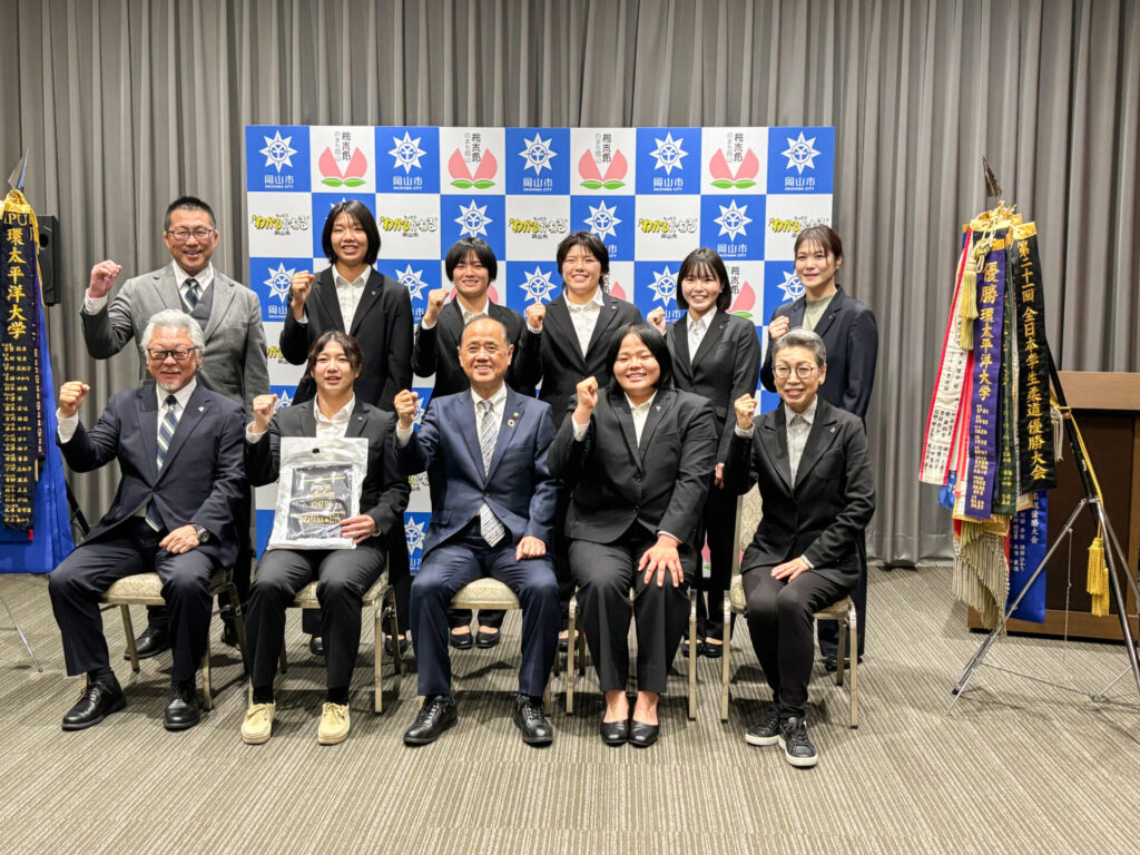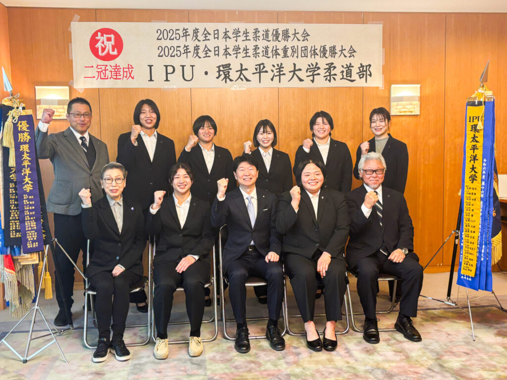環太平洋大学女子柔道部は、2025年度全日本学生柔道優勝大会および全日本学生柔道体重別団体優勝大会において大会2冠を達成しました。これを受け、令和8年1月21日、岡山県知事、岡山市長、山陽新聞社を表敬訪問し、日頃のご支援への感謝とともに大会結果を報告しました。
