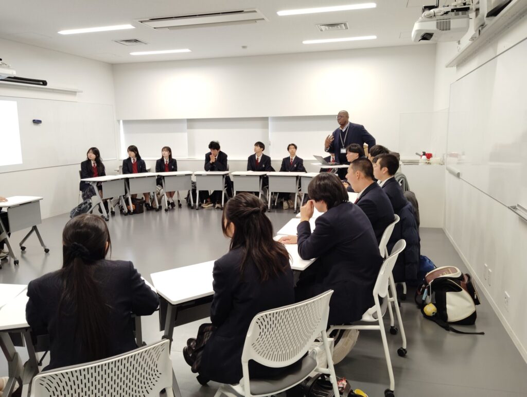 午後は、1年生は引き続き英語レッスンに取り組み、2年生は英語による探究学習発表会を実施しました。高校での探究活動の成果を英語で発信するという挑戦的な取組に対し、本学教員である小川正人教授、竹下厚志教授から、質疑応答および専門的な観点に基づく指導・助言が行われました。高校生たちは大学教員からの鋭い問いに真摯に向き合い、自身の問いや主張を見直しながら、探究を一層深化させていく姿を見せていました。発表会は予定時間を超えるほど活発な議論が交わされ、学びの密度の高さが印象的でした。