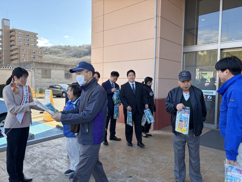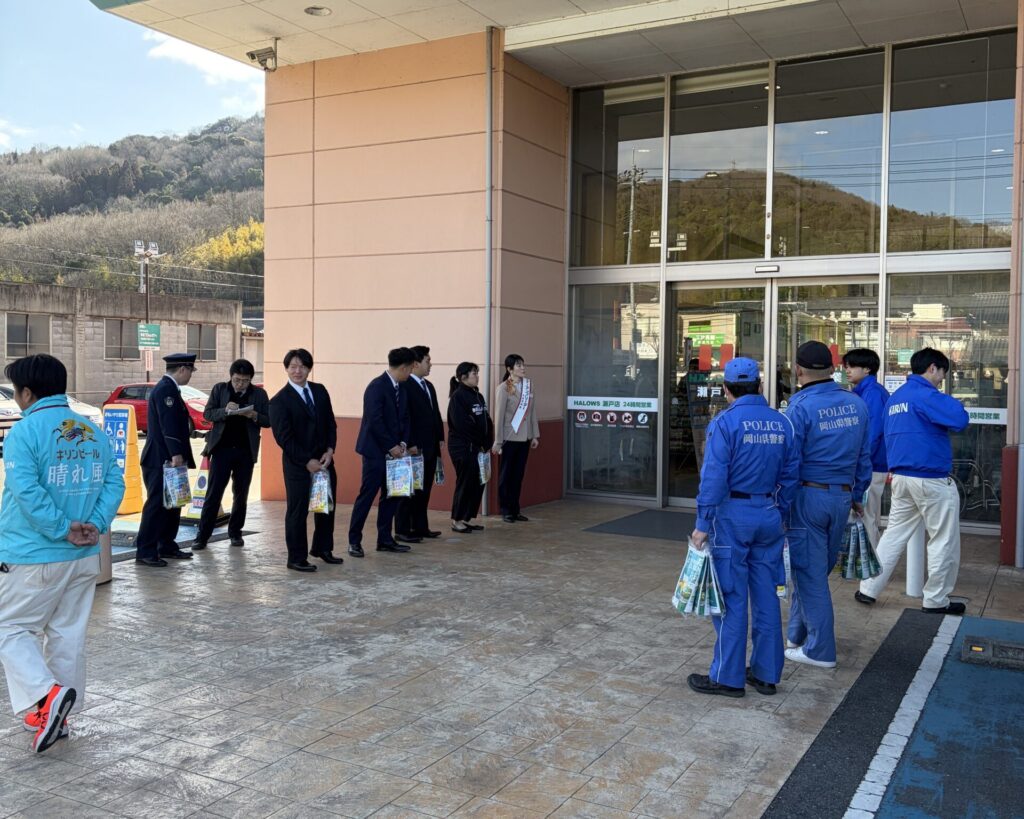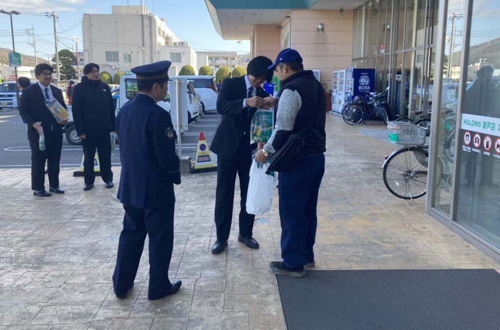 運転マナーアップリーダーの委嘱式に出席し、キリンビール株式会社のスタッフが委嘱を受けた後、ハローズ瀬戸店にて、買い物客の皆さまに飲酒運転防止の呼びかけと啓発物の配布を行いました。