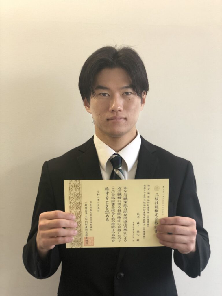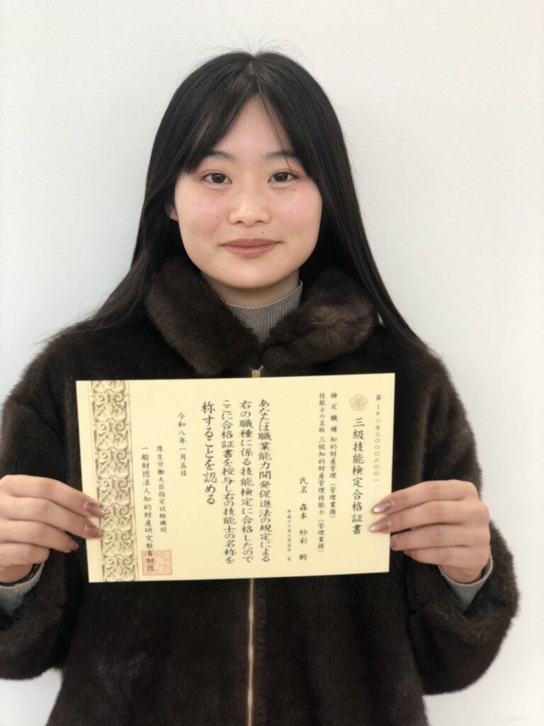 2025年4月に開講した経済経営学部現代経営学科の授業「知的財産管理技能」を通じ、知財マネジメントスキルを測る国家資格「三級知的財産管理技能士」の検定試験に新たに3名が合格しました!知的財産管理技能検定は、技能検定(働くうえで身につける、または必要とされる技能の習得レベルを評価する国家検定制度)の中の「知的財産管理」という職種に関する国家試験です。
