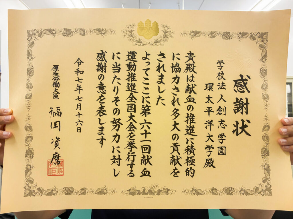 令和7年7月28日、岡山国際交流センターにおいて、「令和7年度献血感謝の集い」が開催され、環太平洋大学は献血運動推進協力団体として厚生労働大臣感謝状をいただきました。この感謝状は、10年以上にわたり献血に協力し、顕著な功績のあった団体に贈られるものです。多くの学生・教職員による、長年にわたる献血活動への協力が認められたことになります。
