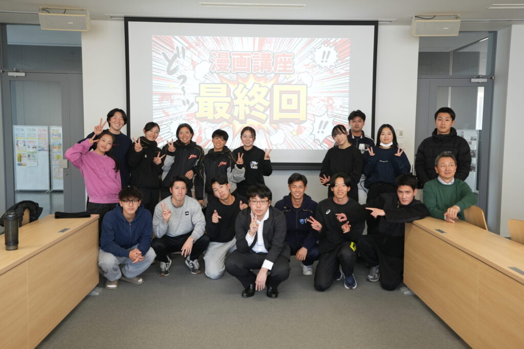講義の最後には、完成した漫画をスクリーンに映しながら全員で記念撮影を行い、拍手と共に講座は幕を閉じた。 学生たちにとって、漫画は「読むもの」から「自らのメッセージを伝えるための強力なツール」へと変わったに違いありません。