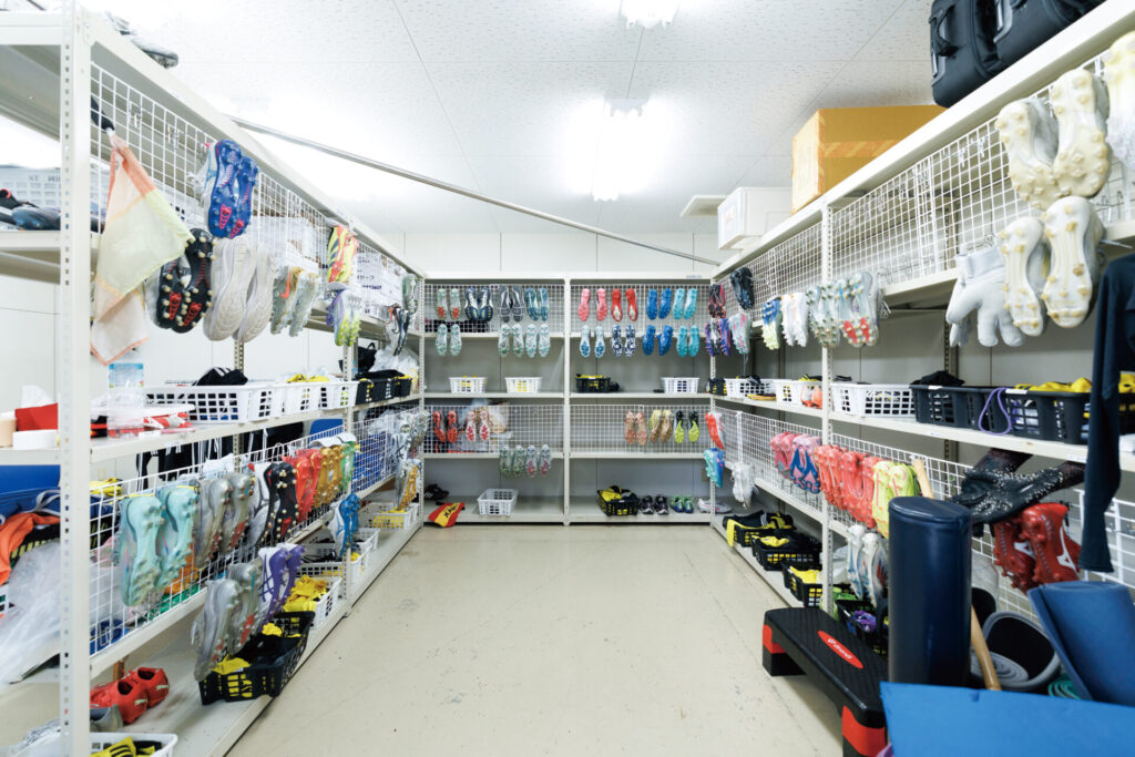 クラブハウスの用具庫や部室には、きちんとメンテナンスされたトレーニング用具やスパイク、ウェアが整然と収納されています。選手全員が気持ちよく利用できるよう整理整頓にも気を配っています。