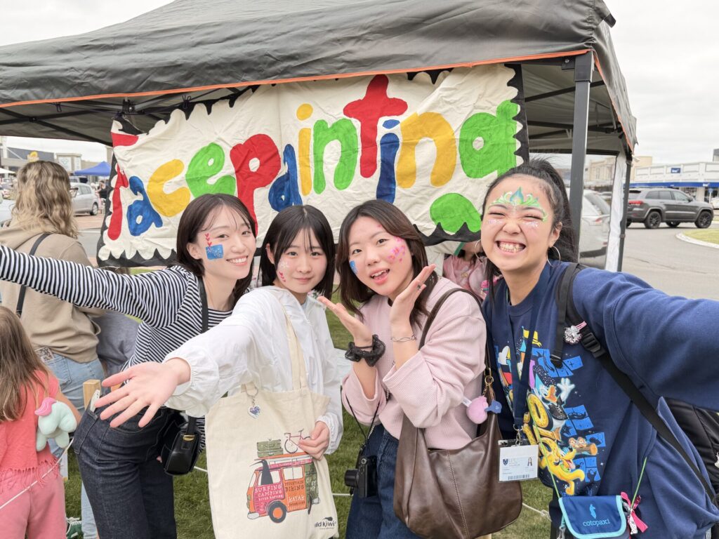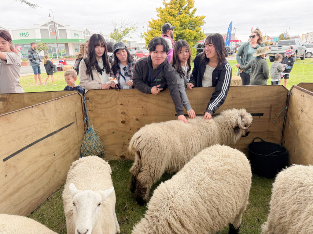 まず参加したのは、大学のあるパーマストンノースから車で約30分のフィールディングで開催された「キッズカントリー」です。地域の大人たちが子どものために企画するイベントで、学生たちはニュージーランド名物の羊と触れ合ったり、フェイスペイントやさまざまなアクティビティに参加したりしました。地域全体で子どもを楽しませようとする雰囲気は、学生たちにとって印象的な体験となりました。