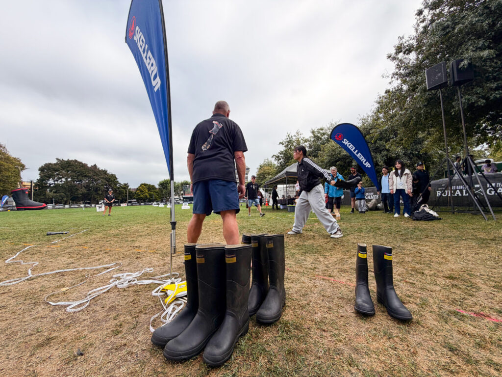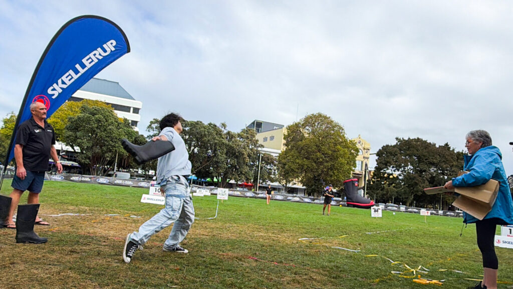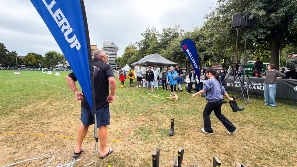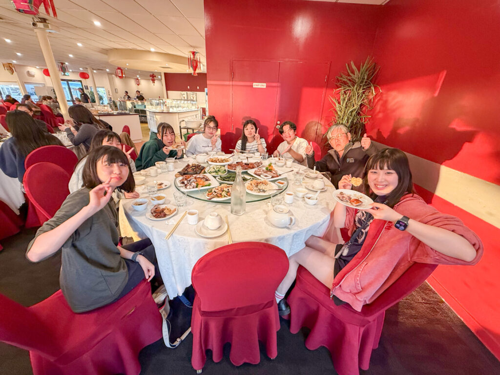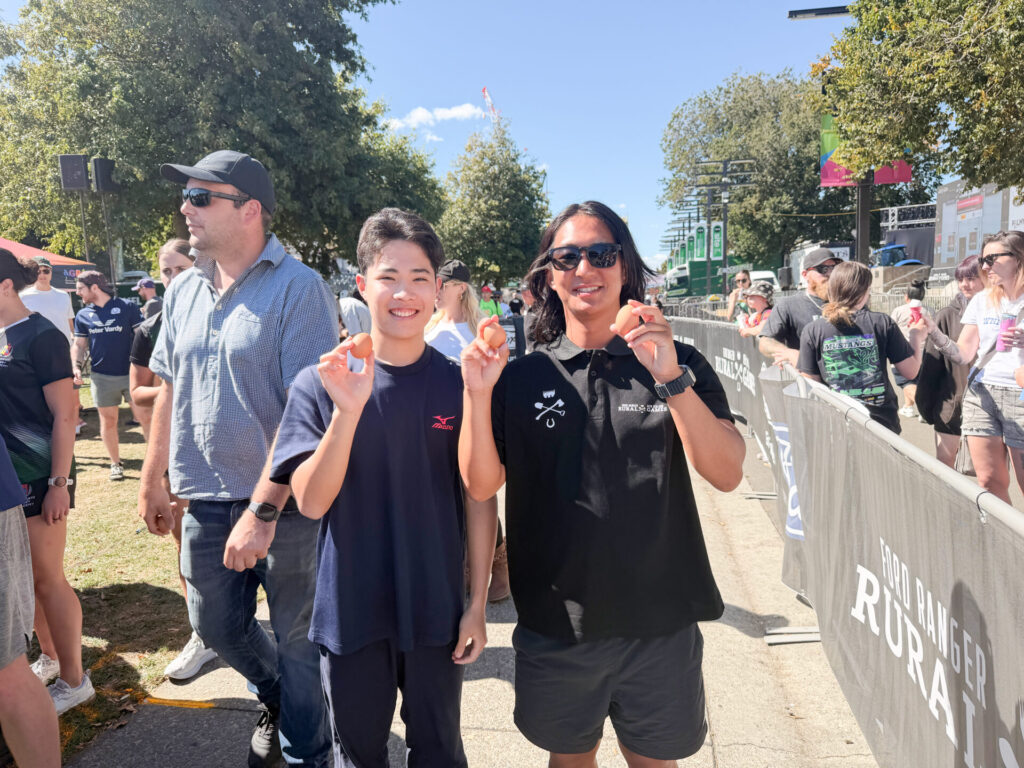また、パーマストンノースで開催された秋のイベント「ルーラルゲーム」にも参加しました。羊の毛刈り競争、長靴投げ、丸太早割り対決、藁のスピード積み競争など、林業や農業が盛んなニュージーランドならではの催しが行われており、地域の特色を肌で感じることができました。さらに、卵割りルーレットでは小崎先生が見事優勝し、会場は大いに盛り上がりました。