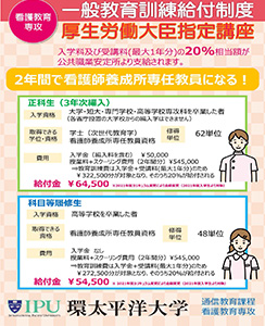 看護教育専攻においては、正科生3年次編入学および科目等履修生のコースが、厚生労働大臣から一般教育訓練給付制度の対象に指定されています。 詳細は、看護教育専攻 一般教育給付金制度詳細ページ または『看護教育専攻 一般教育訓練給付制度についてのPDF 』をご確認ください。